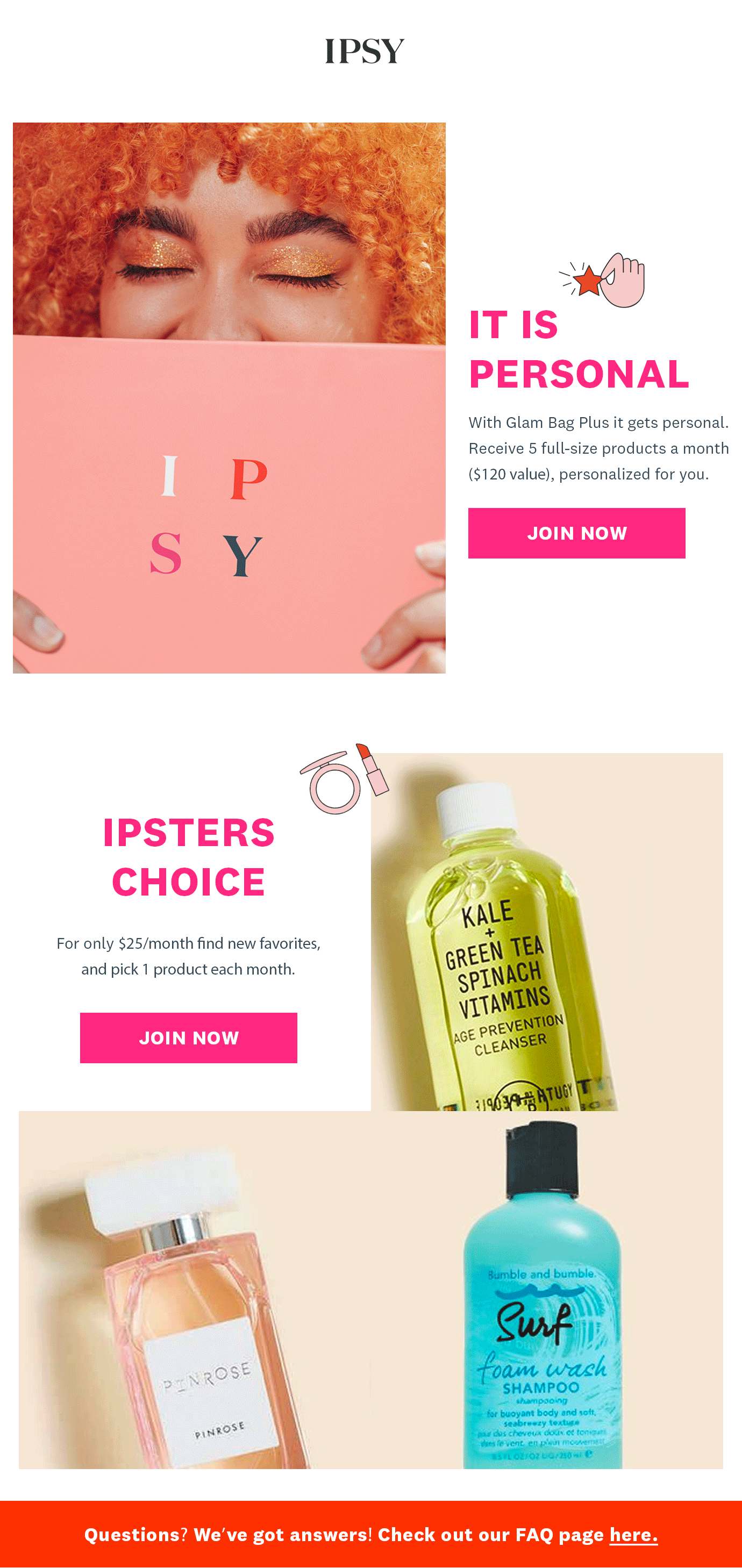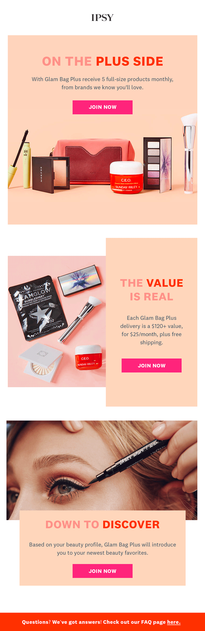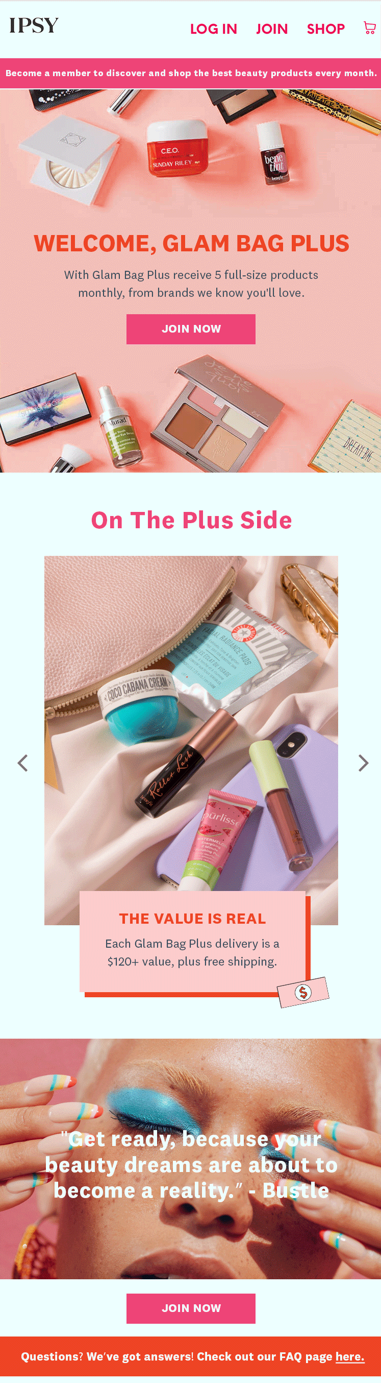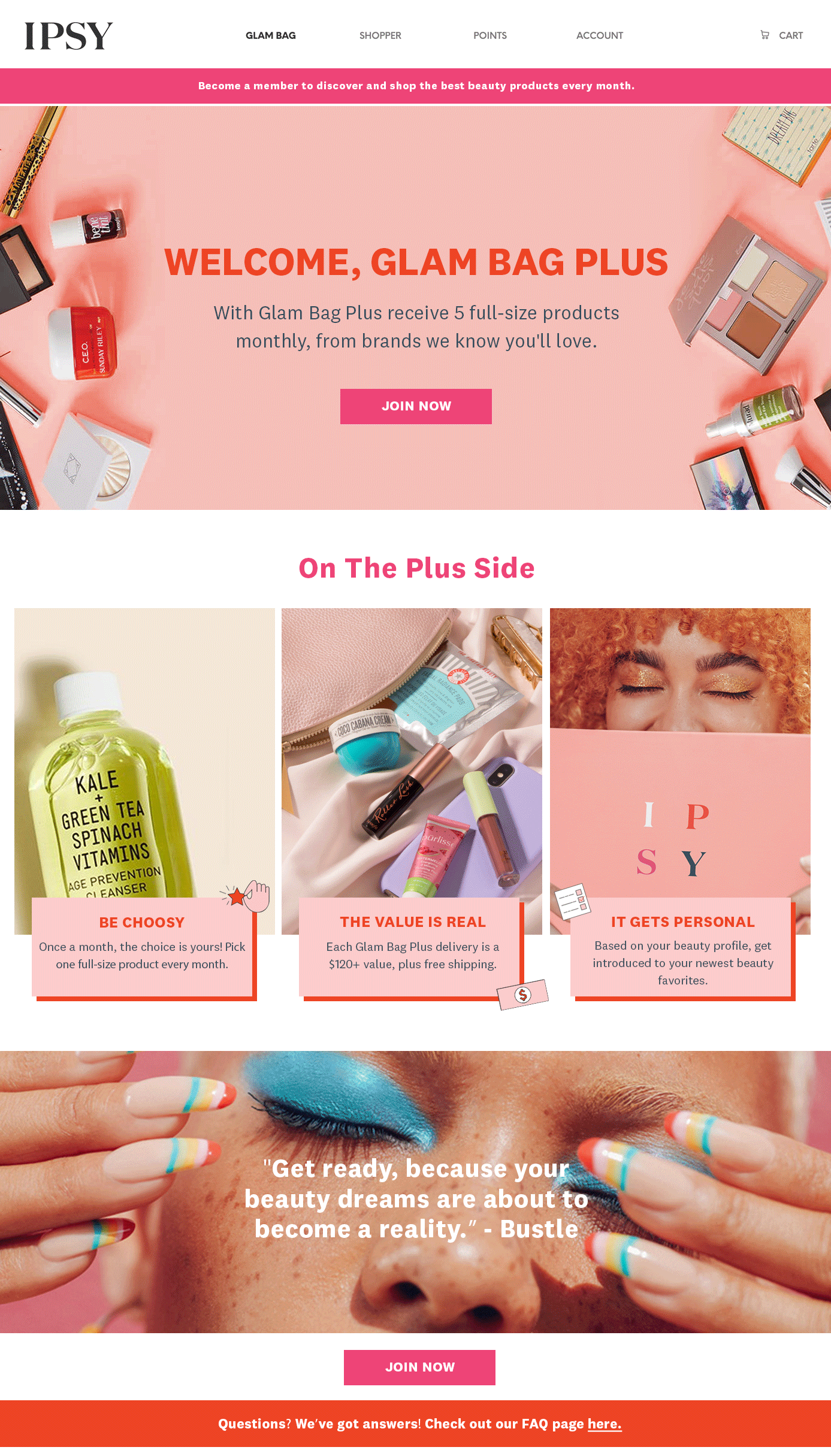 Used brand guidelines to concept and execute both assets and copy to introduce new audiences to Ipsy’s Glam Bag Plus program. Created a consistent look + feel, and messaging across landing pages, email campaigns and paid advertising.